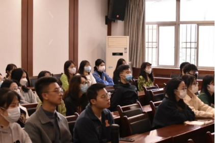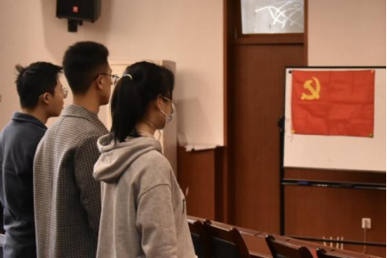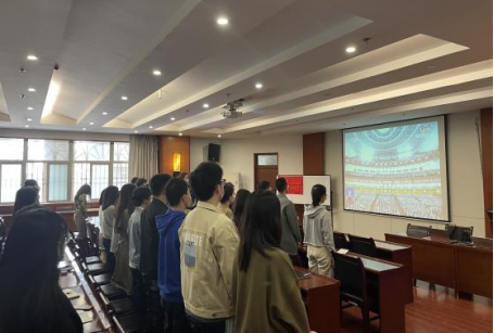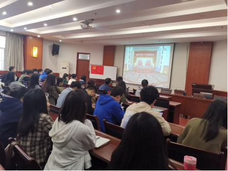 研综楼学术报告厅充满了庄严而神圣的氛围,部分同学早早来到会场,齐聚一堂观看中国共产党第二十次全国代表大会开幕会的直播。