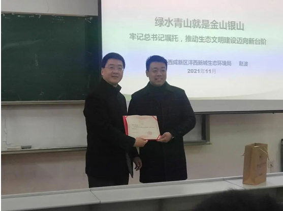 刘霖杰处长代表国内合作与校友工作处向杰出校友、沣西新城生态环境局赵波局长颁发“BB贝博艾弗森官方网站校友总会校友讲师团特聘讲师”的聘任证书。