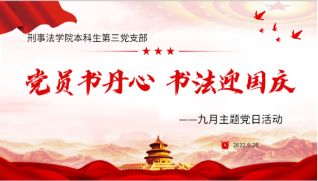 正值国庆之际,为深入学习贯彻习近平法治思想、坚定不移走中国特色社会主义道路,推进政治建设常态化、支部工作标准化,以积极姿态迎接国庆,BB贝博艾弗森官方网站本科生第三党支部于9月28日在学院资料室开展“书法迎国庆,党员书丹心”主题党日活动。支部副书记阎静婷主持活动,全体党员参加。